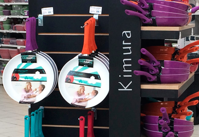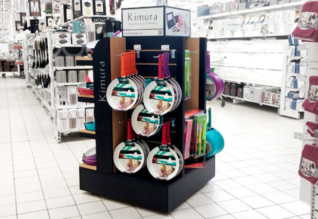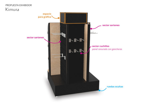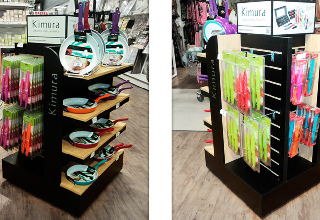 Exhibidor isla para supermercados Se optó por el color negro y la madera para resaltar el colorido de los productos. Contempla espacio para gráfica en laterales y parte superior. Productos a exhibir: cuchillos cerámicos, sartenes y asaderas. Materiales: MDF melamínico